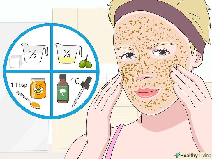 Додайте масло чайного дерева в домашній скраб для обличчя. щоб зробити ефективний скраб для боротьби з прищами, спробуйте змішати масло чайного дерева з іншими натуральними інгредієнтами з кухонного шафки. У невеликій мисці змішайте півсклянки цукру, 1/4 склянки кунжутного або оливкового масла, 1 столову ложку меду і приблизно 10 крапель олії чайного дерева. Нанесіть маску на вологу коджу і акуратними, круговими рухами масажуйте обличчя протягом 2-5 хвилин. Потім змийте маску теплою водою і висушіть шкіру легкими рухами. [5]- Цей скраб може бути трохи агресивний для людей з кістозною формою акне, однак він відмінно підходить в разі легких або середніх висипань.