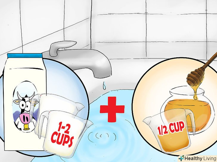 - Поки ванна наповнюється теплою проточною водою, налийте туди ж 1-2 склянки молока і півсклянки меду. Додавайте молоко і мед у воду, поки вона не стане однорідною. [2]