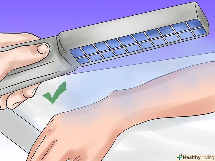 Експериментуйте з фототерапією. якщо інші методи лікування не справляються з проблемою свербіння і подразнення шкіри, ваш лікар може порекомендувати спеціальну терапію, яка поєднує в собі вплив хвиль ультрафіолетового (УФ) світла певної довжини з деякими препаратами, що допомагають зробити вашу шкіру більш сприйнятливою до УФ-випромінювання. [21] фототерапія ефективна в разі багатьох шкірних захворювань, особливо при лікуванні екземи, за рахунок збільшення після проходження курсу терапії кількості виробленого вашою шкірою вітаміну D; також терапія вбиває будь-які знаходяться на шкірі мікроорганізми, зменшує запалення, свербіж і прискорює загоєння. [22]- Для лікування більшості шкірних захворювань найчастіше дерматологами рекомендується вузька смуга ультрафіолетових променів B (UVB).