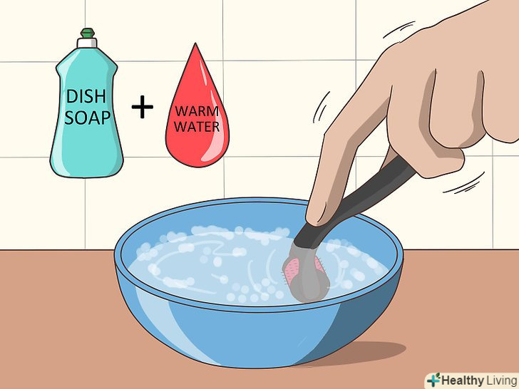 Промийте роллер милом і водою. вимийте мезороллер засобом для миття посуду і гарячою водою. Засіб для миття посуду краще за інших видів мила видаляє найдрібніші частинки крові і шкіри з роллера. Налийте мило і воду в чисту ємність. Опустіть ролер в воду і гарненько поводите їм з боку в бік. [15]