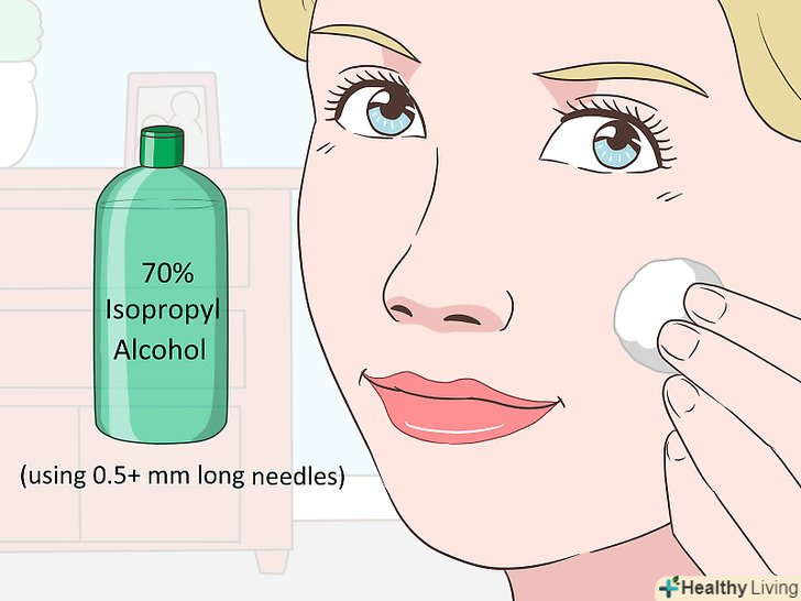 Продезінфікуйте шкіру, якщо використовуєте Ролери з довгими голками. довші голки проникають в шкіру глибше, а це може може призвести до інфекції. Якщо ви використовуєте голки довжиною більше 0,5 мм, крім роллера слід продезінфікувати і шкіру. Акуратно протріть обличчя антисептиком для рук і шкіри. [5]