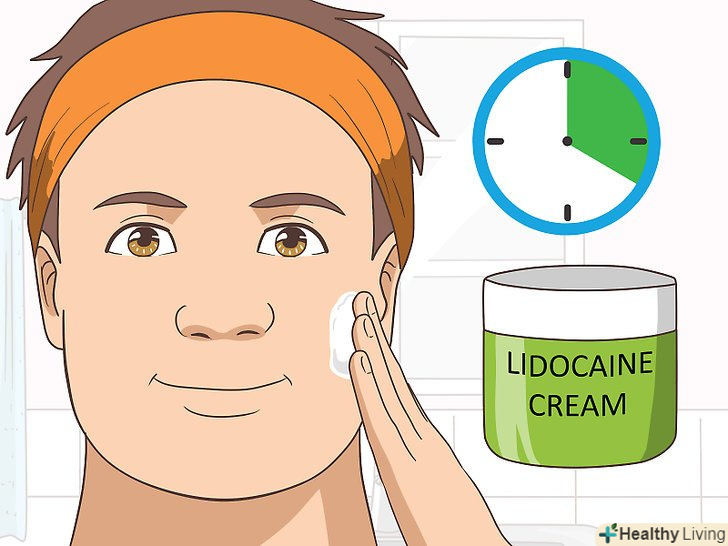 Якщо хочете, спочатку нанесіть знеболюючий крем. більшість людей не чутливі до уколів крихітними голками, але якщо ви не з їх числа і чутливі до болю, то можна спочатку нанести знеболюючий крем. Особливо у випадку, якщо ви використовуєте дермароллер з голками довжиною 1 мм або більше. Нанесіть крем з лідокаїном на область застосування мезороллера і почекайте 20 хвилин, поки крем почне діяти. [6]- Перед мікронідлінгом витріть надлишки крему.