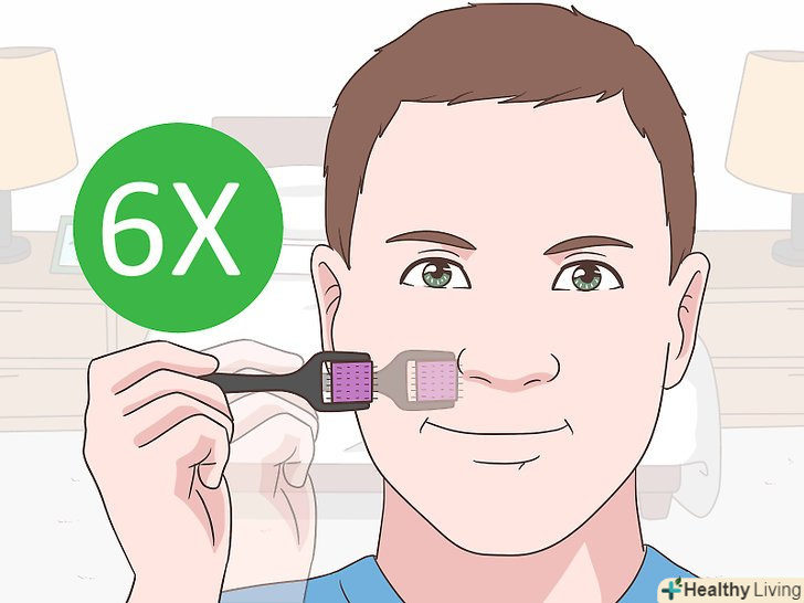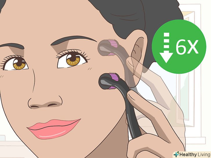 Проведіть роллером горизонтально. Прокатайте область горизонтально, почавши зверху або знизу. Підніміть і ще раз пройдіться мезороллером по цій області. Всього потрібно повторити 6 разів. Перемістіть роллер трохи вниз або вгору і повторіть всю послідовність, поки не виконаєте мікронідлінг всієї області. [9]- Також можна прокатувати по діагоналі, але це може викликати нерівномірний вплив голок на шкіру.