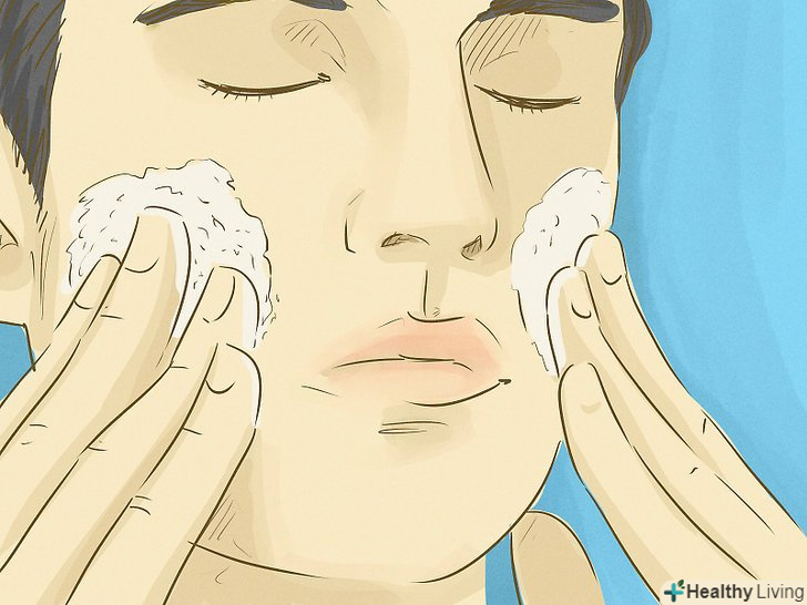 Подушечками пальців нанесіть на шкіру обличчя м'який Очищуючий засіб. найкраще вмиватися спеціальними пінками і засобами для вмивання. Видавіть трохи засобу для чищення на руки і подушечками пальців масажними рухами втирайте цей засіб в шкіру. [2]- Обов'язково закрийте очі, щоб миючий засіб не потрапило в них.