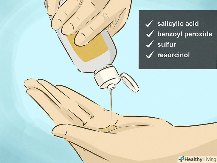 Спробуйте очищаючий засіб від прищів. якщо ваша шкіра схильна до появи прищів, то буде корисним використовувати аптечний засіб від прищів, що відпускається без рецепта. Знайдіть відповідний засіб, який включає натуральні інгредієнти — саме вони можуть допомогти в боротьбі з висипом вугрів. [8]- Наприклад, вам можуть підійти засоби, що містять саліцилову кислоту, пероксид бензоїлу, сірку або резорцин. Ці косметичні продукти відпускаються без рецепта.