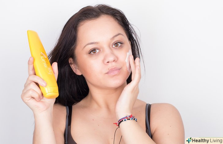 - Застосовуйте сонцезахисний крем з високим фактором SPF, якщо ви проводите велику кількість часу на сонці. Американська академія дерматології рекомендує вибирати SPF зі значенням не менше 30. Чим вище SPF, тим вище захист від ультрафіолетового випромінювання і сонячних опіків. Якщо ви знаходитесь на пляжі або в басейні, обов'язково постійно оновлюйте засіб на шкірі або користуйтеся вологостійким сонцезахисним кремом.
