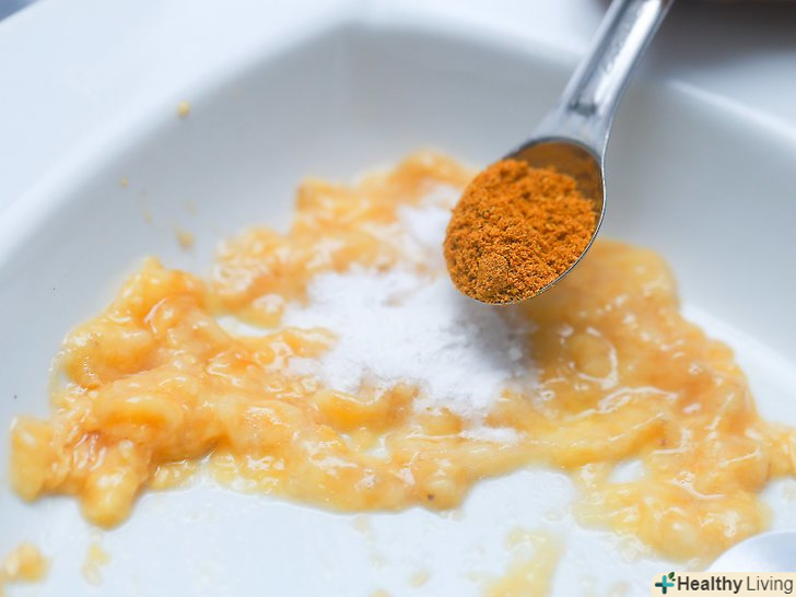 Зробіть бананову маску для шкіри, схильної до акне. розімніть стиглий банан в невеликій мисці. У вас повинна вийти пастоподібна однорідна суміш. Додайте 1/2 чайної ложки соди і 1/2 чайної ложки порошку куркуми. Змішайте всі три компоненти, щоб у вас вийшла однорідна суміш. Нанесіть маску на обличчя на 10-15 хвилин. Через зазначений час, обполосніть обличчя теплою водою і промокніть його сухим рушником. [5]- Зверніть увагу, що куркума сильно забарвлює шкіру пальців і навколо нігтів в жовтий колір, і відмити руки після неї досить складно. Тому наносите куркуму за допомогою кисті для макіяжу. Завдяки цьому ваші пальці залишаться чистими.