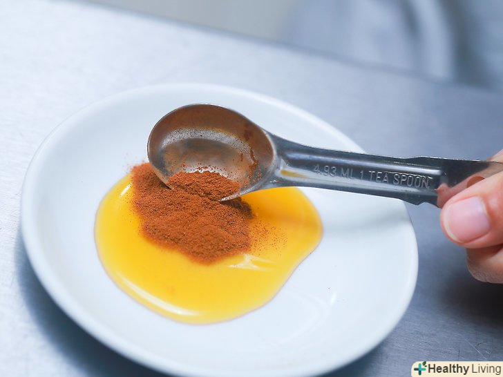 Приготуйте медову маску для шкіри, схильної до акне. змішайте в невеликій мисці 3 чайні ложки сирого меду з 1/2 чайної ложки кориці. Нанесіть суміш на обличчя на 20-30 хвилин, потім змийте теплою водою. [9]- Якщо у вас чутлива шкіра, кориця може викликати роздратування. Якщо ви не впевнені в тому, як ваша шкіра буде реагувати на корицю, можна нанести її на невелику ділянку шкіри, перш ніж наносити на всю поверхню шкіри обличчя. [10]