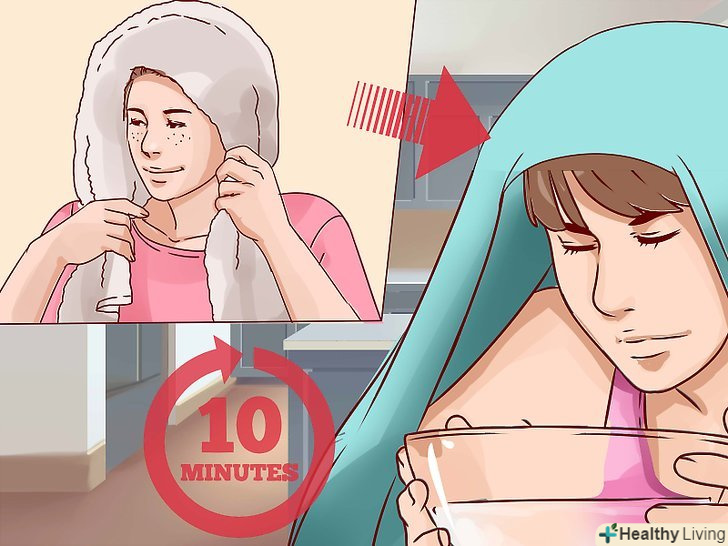 Нахиліться над мискою з водою. тепер можна приступати до розпарювання. Накрийте голову великим рушником, нахиліться над мискою, щоб від миски до особи було приблизно 30 сантиметрів. Закрийте очі і розслабтеся. [23]- Розпарюйте обличчя протягом 10 хвилин. Пар розкриє пори і очистить їх.
