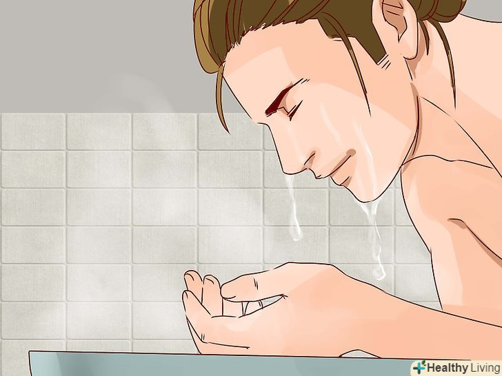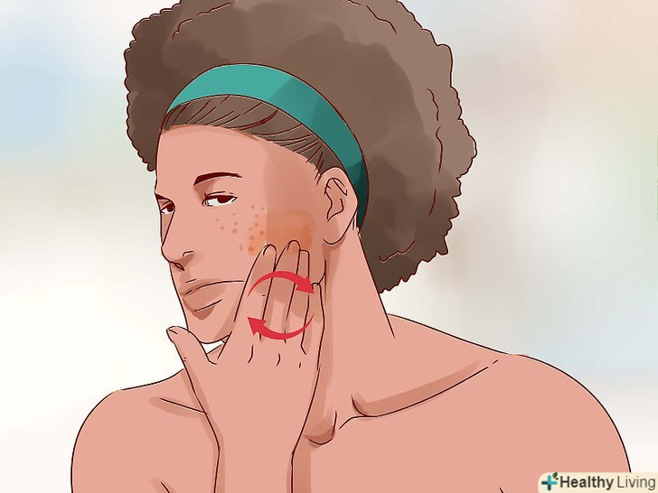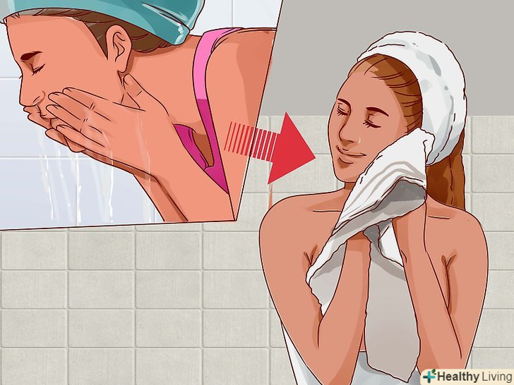 Помийте обличчя. зберіть волосся, закріпивши їх обідком, шпилькою або гумкою. Намочіть обличчя теплою водою. Нанесіть засіб для вмивання пальцями легкими круговими рухами. Масажуйте шкіру приблизно хвилину. [18]- Змийте засіб теплою водою. Витріть чистим бавовняним рушником.