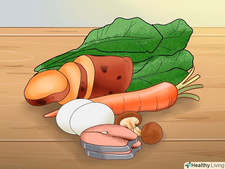 Збільште споживання вітамінів А і D. вітамін А і D підвищують імунітет. Крім того, вітамін А є натуральним антиоксидантом [20] , А вітамін D дозволяє зменшити запалення, має антибактеріальний ефект, а також допомагає скоротити виділення шкірою жиру. [21] Збільште в своєму раціоні кількість продуктів з вмістом цих вітамінів.- Продукти з високим вмістом вітаміну А: овочі (батат, шпинат та інші листові овочі, морква, гарбуз, брокколі, червоний перець, кабачок), фрукти (диня, манго, абрикоси), бобові, м'ясо, печінка і риба. [22]