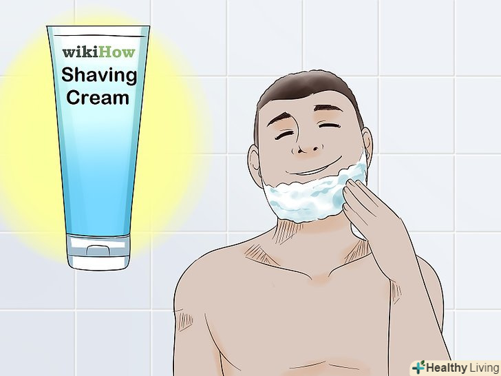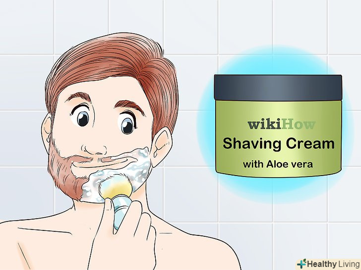 Використовуйте крем для гоління з алое або іншими інгредієнтами для чутливої шкіри. в середині прийому ванни або душу нанесіть крем для гоління. Залиште його хоча б на 3 хвилини, щоб розм'якшити волосся. Алое та інші інгредієнти в кремі для гоління створять поверхню для більш гладкого гоління з мінімальним роздратуванням.- Джентльмени, вам може сподобатися крем для гоління вашої дівчини. Засоби для жіночих ніжок зазвичай краще зволожують і заспокоюють шкіру. [11] вас адже не збентежить рожевий колір банки, правда?