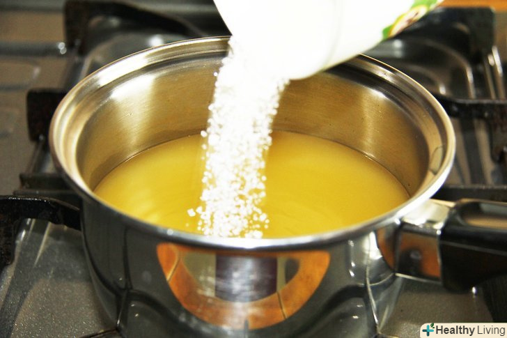 Змішайте цукор, лимонний сік і воду в каструлі і поставте на маленький вогонь. використовуйте термометр для карамелі, щоб стежити за температурою воску. Слідкуйте, щоб суміш не закипіла.
