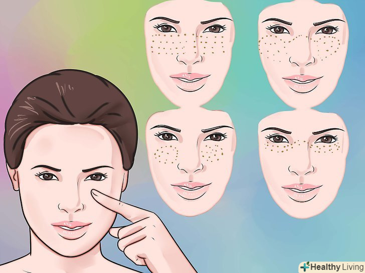 Визначте місце для найкращого розташування веснянок. Вам необхідно зробити так, щоб ваші веснянки виглядали природно, тому і розміщувати їх потрібно природним чином.- Майданчик - для отримання природної "майданчики" почніть нанесення веснянок від перенісся. Вам необхідно рівномірно розподілити їх від перенісся до вилиць. Слід зупинитися біля лінії росту волосся або навіть нанести меншу кількість веснянок в області очей. [10]