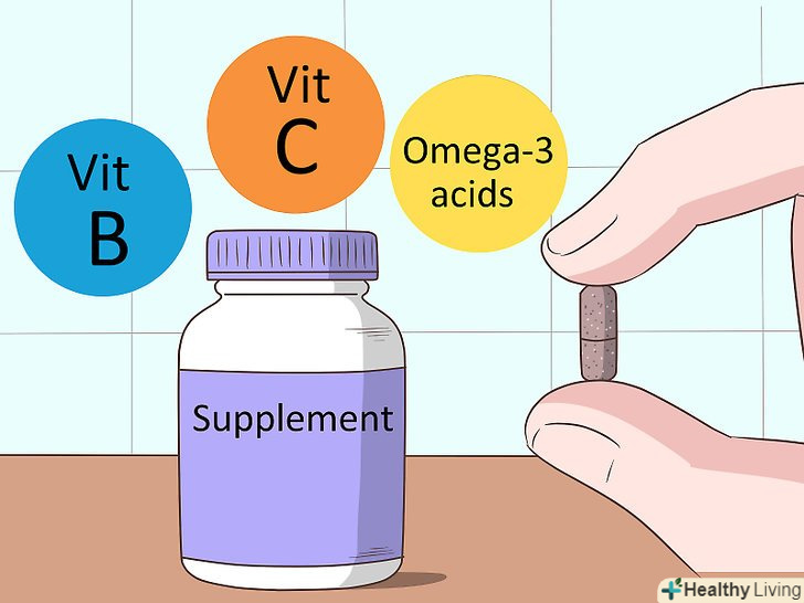 Приймайте вітаміни, які сприяють зволоженню шкіри. під здоровою шкірою зазвичай мається на увазі зволожене обличчя, і вітаміни можуть допомогти зберегти вашу шкіру здоровою. Приймайте добавки, які включають вітаміни В і С, а також омега-3 кислоти.- Якщо ви не любите приймати вітаміни, то їжте продукти, багаті вітамінами: банани, брокколі, горіхи і насіння, шпинат, полуницю, лимони, картоплю і грушу. [18]