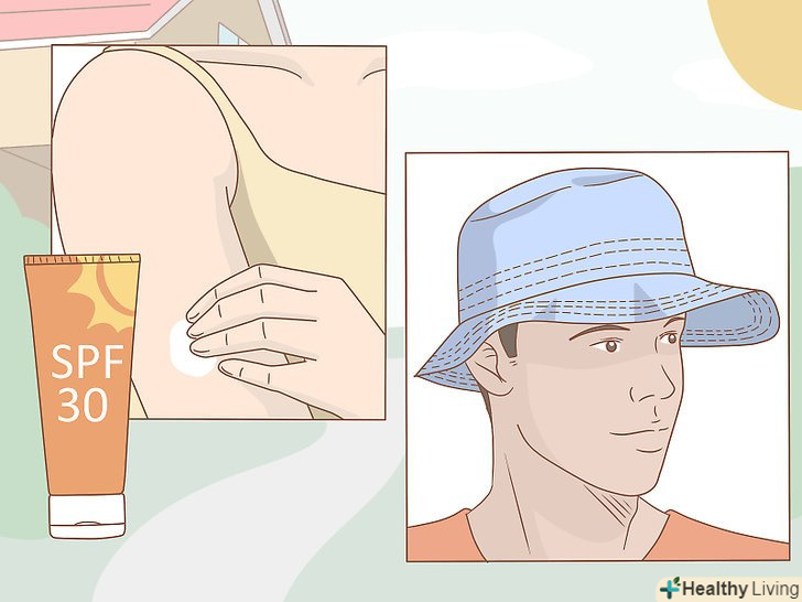 Захищайте шкіру від сонця. не забувайте захищати свою шкіру, коли перебуваєте на вулиці. Надмірне перебування на сонці підвищує ризик раку та інших проблем зі шкірою в майбутньому.- Використовуйте сонцезахисний крем . Виберіть крем з коефіцієнтом SPF не нижче 30. Якщо ви збираєтеся провести на вулиці цілий день, повторно наносите сонцезахисний крем кожні дві години. [9]