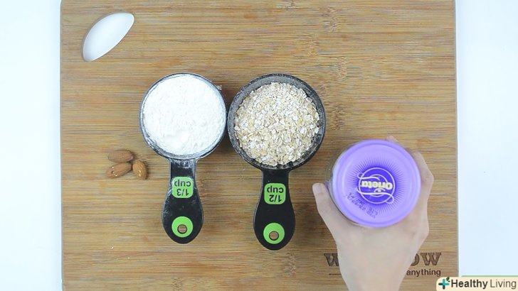 Підготуйте необхідні інгредієнти. для приготування цього засобу ви будете використовувати вівсяну і мигдальне борошно. Мигдальне борошно допомагає позбутися від мертвих клітин шкіри, а вівсяне борошно є прекрасним миючим засобом. Вам знадобляться: [9]- ½ чашки (40 г) вівсяної муки