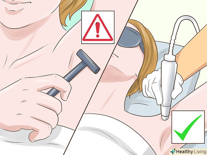 Акуратно позбавляйтеся від волосся на тілі. гоління або епіляція залишають пори і фолікули вразливими до потрапляння бактерій, що може привести до виникнення прищів. Можливо, замість цього вам варто подумати про лазерну епіляцію, так як вона менше дратує шкіру. Якщо ви голитеся, не забувайте наносити крем для гоління, розроблений для чутливої шкіри. [17]- Це особливо важливо, якщо висипання з'являються навколо лінії бікіні.