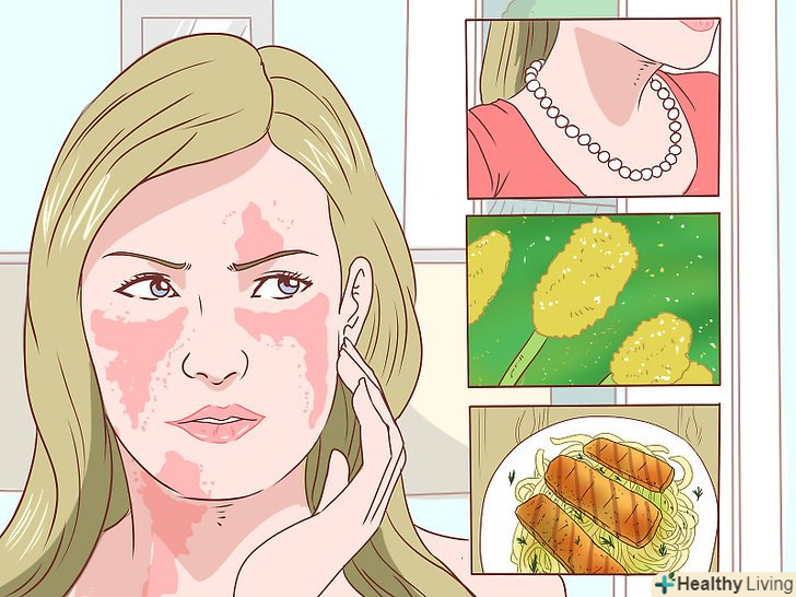 Дізнайтеся про фактори, пов'язані з навколишнім середовищем. запалення шкіри може бути викликане зовнішніми факторами. Одна з частих причин роздратування шкіри-сонячні опіки, також варто згадати і інші фактори, наприклад, контакти з деякими продуктами харчування і рослинами. При вживанні в їжу продукту або при зіткненні з рослиною, на які у вас алергія, ви можете зіткнутися із запаленням на шкірі. [8]- У деяких людей з'являються симптоми дерматиту, якщо вони носять прикраси, які містять навіть невелику кількість нікелю. Якщо у вас чутлива шкіра, перед тим як вибирати прикраса, дізнайтеся з чого воно зроблено.