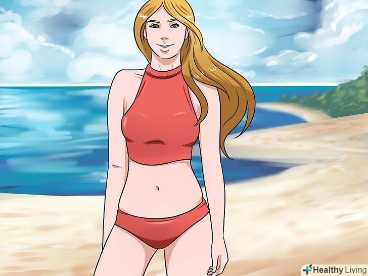Виберіть відповідний купальник. хоча в наш час популярні досить відкриті купальники, віддайте перевагу тим, які будуть закривати ваші проблемні ділянки. Якщо ви все-таки хочете більш відкритий купальник, виберіть той, який буде підкреслювати достоїнства вашої фігури, при цьому приховуючи її недоліки. Також можна зупинити свій вибір на купальнику з сітчастими вставками, який приховає розтяжки і підкреслить достоїнства вашої фігури. [7]