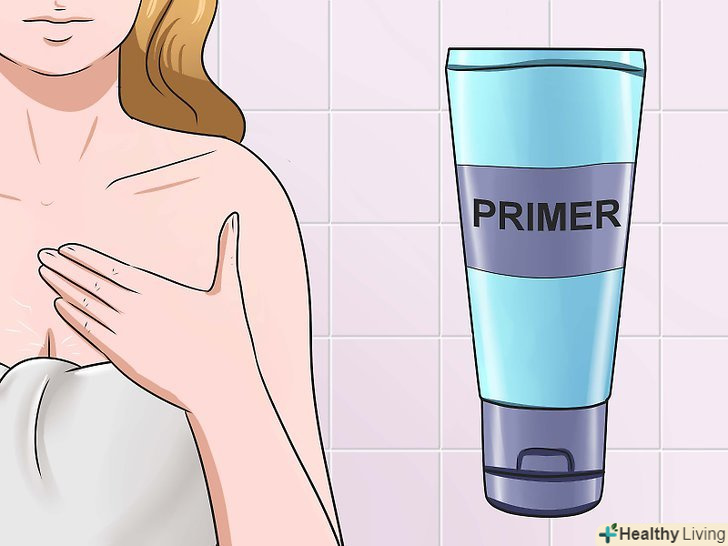 Підготуйте ділянку тіла, на який ви будете наносити косметичний засіб. Ваша шкіра повинна бути чистою і сухою. Нанесіть невелику кількість зволожуючого крему. Щоб косметичний засіб довше залишалося на шкірі, нанесіть невелику кількість праймера на шкіру. Праймер може візуально згладити дрібні зморшки і нерівності шкіри. [8]