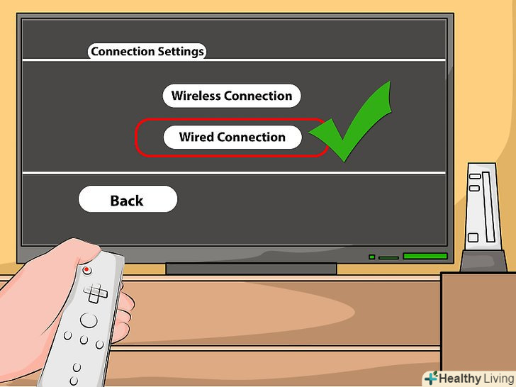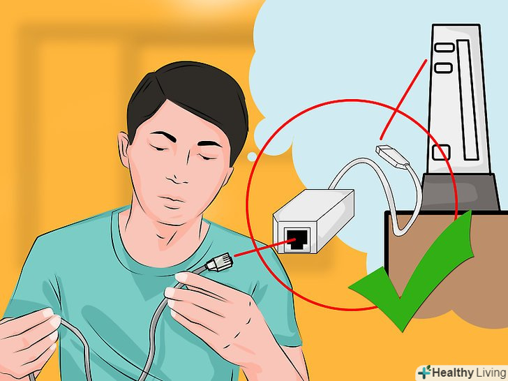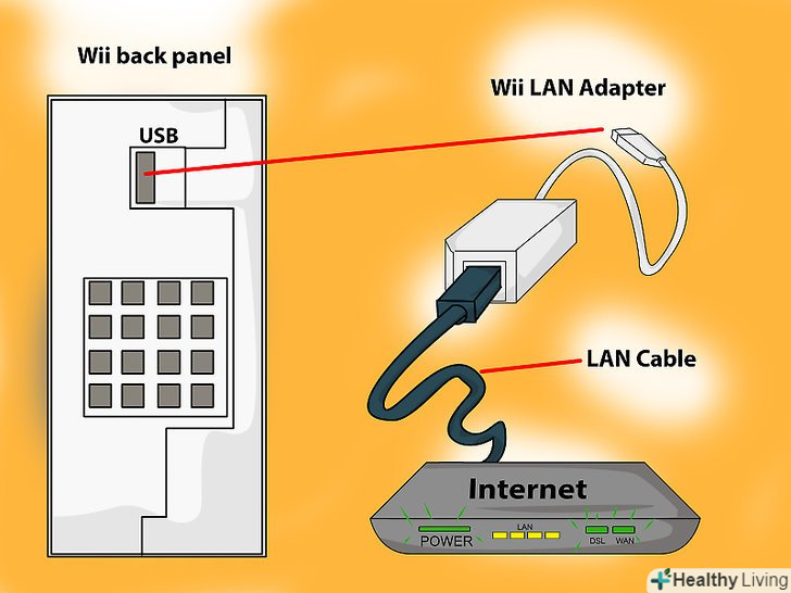 Купуйте адаптер Wii LAN Adapter.щоб підключиться до мережі за допомогою кабелю, вам треба купити і підключити спеціальний адаптер. Адаптер не включений в коробку з Wii, а інші адаптери не від Nintendo просто не будуть працювати.