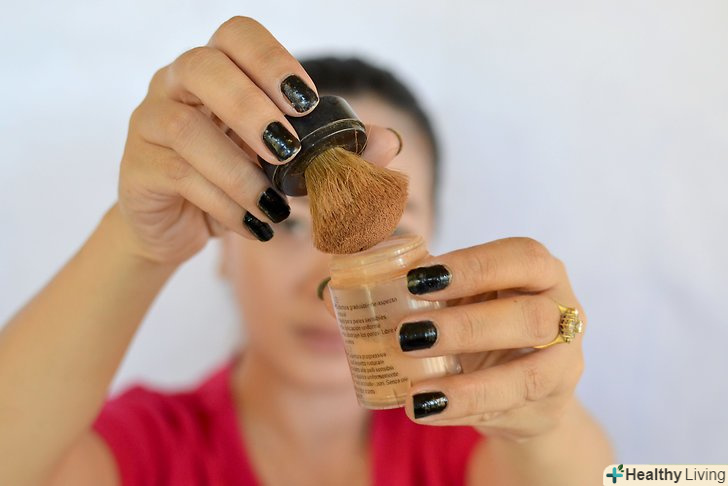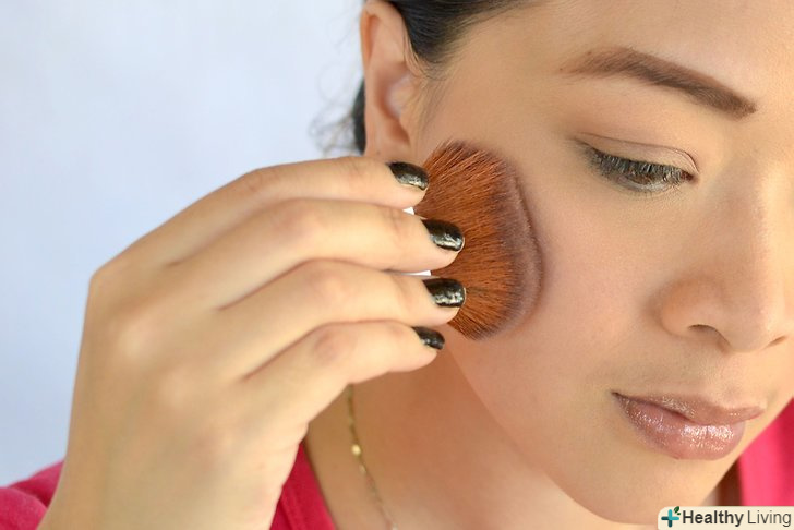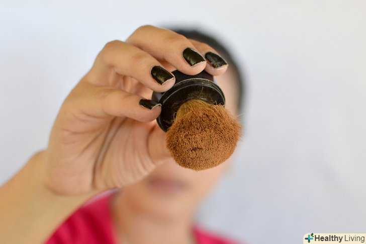Виберіть розсипчасту пудру в тон вашої основи. Пудра додасть вашій шкірі сяйва і підкреслить риси обличчя, а не пори.- Для рівного нанесення пудри, купіть спеціальну м'яку круглу кисть з рівними краями або плоску по краю.