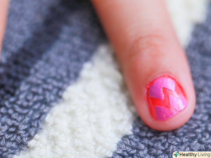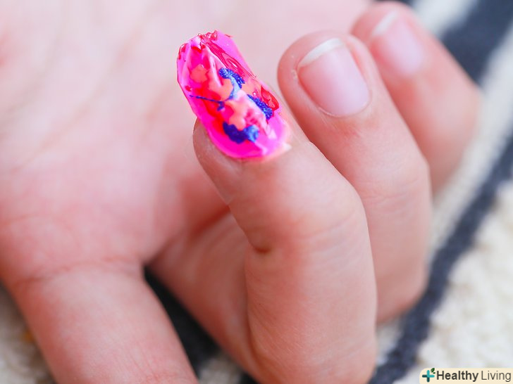 Спробуйте прикрасити ніготь бризками лаку. у вас вже є «захисне покриття» у вигляді штучних нігтів, які можна зняти в будь-яку хвилину, вам також потрібно буде підкласти газету або аркуш паперу, тому що бризки зазвичай далеко розлітаються. Найкраще використовувати кілька кольорів лаку для нігтів. [5]- Оберніть палець скотчем або ганчіркою, щоб не забруднити його. Будьте обережні, не пошкодити нігті!
