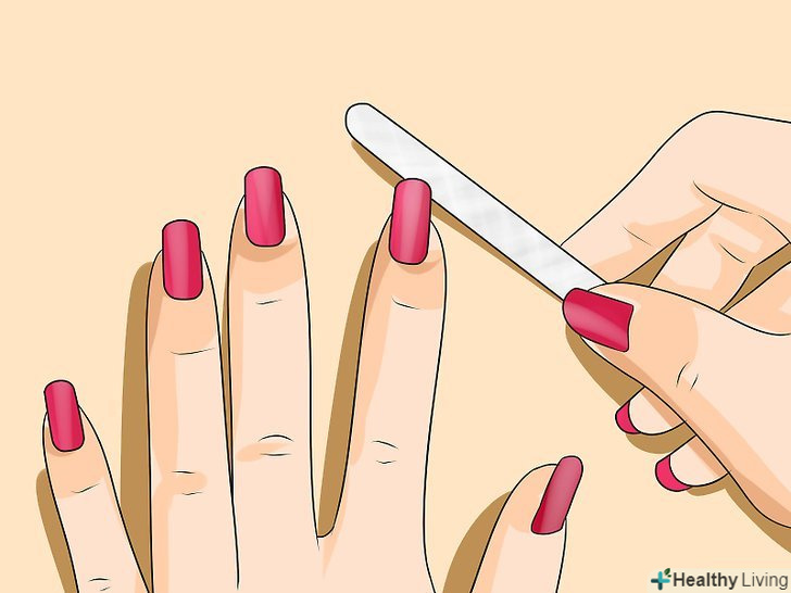 Доглядайте за основою нігтів і підпилюйте її. щоб відростити довгі і міцні нігті, необхідно почати з хорошої основи. Це означає, що спочатку вам потрібні чисті і здорові нігті. Надавайте їм форму пилкою і підрізайте кутикулу.- Правильно підпилюйте нігті. Почніть з зовнішнього краю і рухайтеся до центру. Повторювані рухи туди-сюди послаблять нігті. [7]
