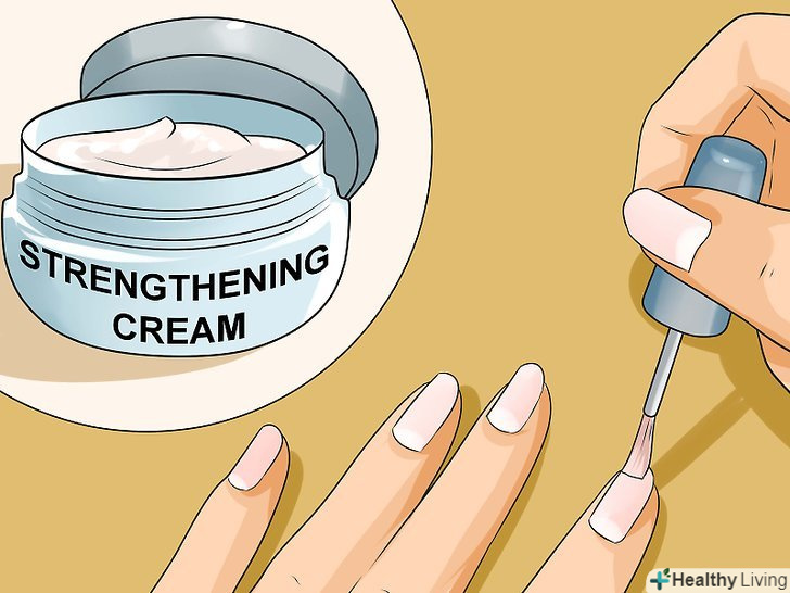 Нанесіть зміцнюючий засіб. існує кілька зміцнювальних засобів. Після використання відповідної основи під манікюр і правильного догляду за кутикулою нанесіть зміцнюючий засіб, який можете собі дозволити, виходячи зі свого бюджету і розпорядку дня. [8]- Сироватки коштують досить дорого, але, найчастіше, дають найшвидший і кращий результат при зміцненні нігтів.