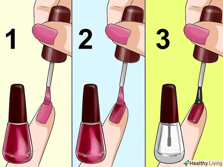 Завжди наносите базу і верхній шар. легко пропустити цей крок, якщо ви поспішаєте і хочете, щоб лак швидше висох. Однак таким чином ви пошкоджуєте нігті. База і верхній шар захищають нігті від появи плям. Крім того, так лак краще закріплюється на нігтях і менше тріскатися і відшаровуватися. А чим менше відшаровується лак, тим менше ймовірність, що ви будете його колупати і ще більше руйнувати нігті. [4]- Носіть в сумочці спеціальні серветки для зняття лаку, щоб швидко змити його, коли він почне відшаровуватися. Таким чином, вам не доведеться колупати нігті.