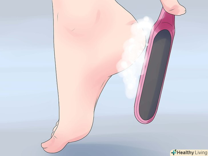 Намочіть пилку для ніг, нанесіть на неї мило і акуратно потріть круговими рухами по всій поверхні п'яти і стопи.