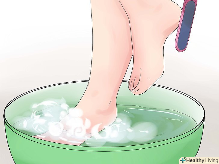 Распарьте ноги у ванні або тазику з теплою мильною водою, тримайте ноги у воді до тих пір, поки вона не охолоне. це допоможе сухій, мозолистій або грубій шкірі пом'якшити. Можна купити пилку для п'ят в косметичному магазині і потерти суху шкіру.