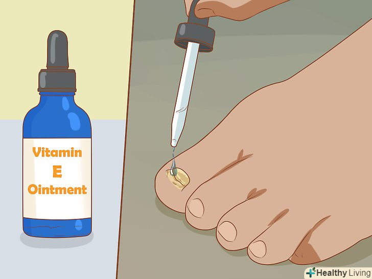 Обробляйте ніготь маззю з вітаміном E, щоб прискорити його зростання. дослідження показують, що засоби з вітаміном E для місцевого застосування допомагають зміцнити здоров'я нігтів і прискорити їх зростання. [15] після того як почне рости новий ніготь, щодня наносите на пошкоджене місце тонкий шар масла або мазі з вітаміном E. [16]- Якщо ви використовуєте не крем або мазь, а масло з вітаміном E, спробуйте змішувати його з невеликою кількістю вазеліну або м'якого зволожуючого засобу, щоб запобігти роздратування і зволожити пошкоджену ділянку.