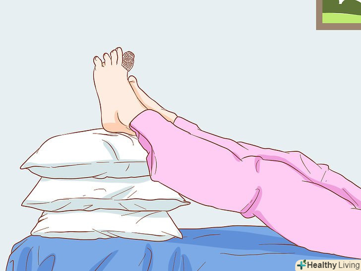 Підніміть ногу з пошкодженим пальцем протягом перших трьох днів після втрати нігтя. після втрати нігтя пошкоджене нігтьове ложе, швидше за все, опухне і запалиться. Щоб звести до мінімуму ці симптоми і прискорити загоєння, по можливості піднімайте ногу протягом декількох перших днів після операції. Намагайтеся тримати пошкоджений палець вище рівня серця. [4]- Наприклад, можна лягти на диван і покласти ногу на його ручку, або лягти на ліжко і підкласти під ногу пару подушок.