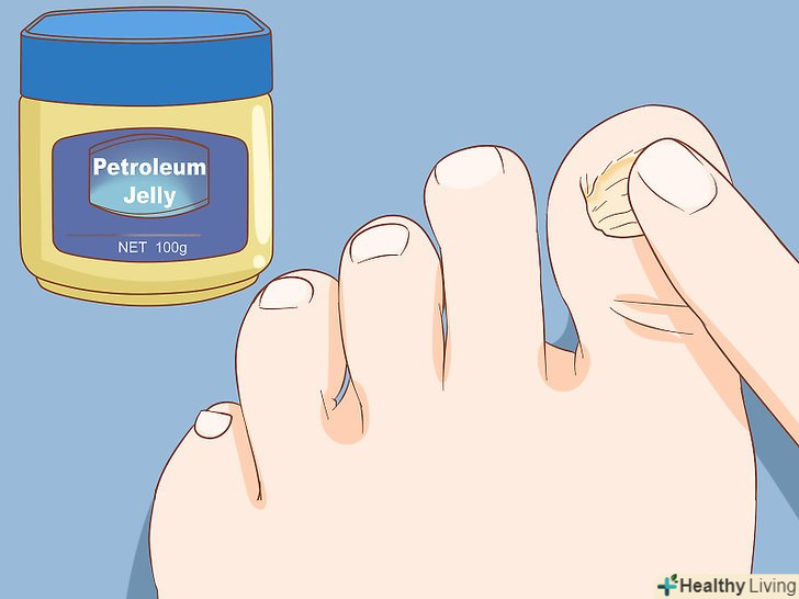 Наносите невелику кількість вазеліну, щоб захистити і зволожити нігтьове ложе. вазелін дозволяє змочити рану і запобігти утворенню струпів, що сприяє швидкому загоєнню. [7] перш ніж перев'язати пошкоджений палець, акуратно нанесіть на нігтьове ложе тонкий шар вазеліну.- Лікар може порекомендувати також обробляти пошкоджене нігтьове ложе антибактеріальною маззю. [8]
