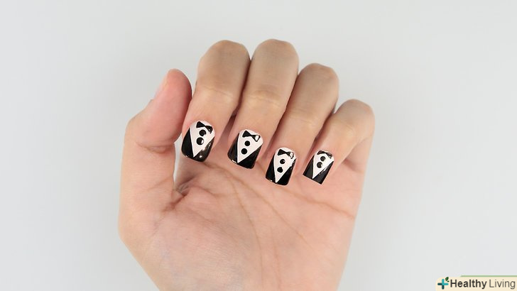 Зробіть дизайн нігтів а-ля смокінг. це яскравий дизайн використовує два контрастних кольору, надаючи ефект смокінгу на білій сорочці.