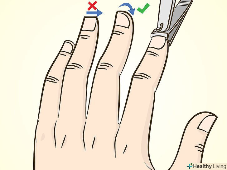 Коротко стрижіть і підпилюйте нігті. це може здатися нелогічним, однак якщо ви будете підстригати нігті, ви дійсно допоможете їм відрости міцними і довгими. Для підстригання нігтів використовуйте невеликі кусачки. Обов'язково обрізайте нігті відповідно до їх природним вигином, а не просто прямо. Після цього підпиляєте нігті акуратними горизонтальними рухами. Не поспішайте і натискайте рівномірно, поки нігті не почнуть коротшати. [8]- Повторюйте процедуру кожні кілька днів, щоб нігті лише злегка виступали за кінчики пальців.