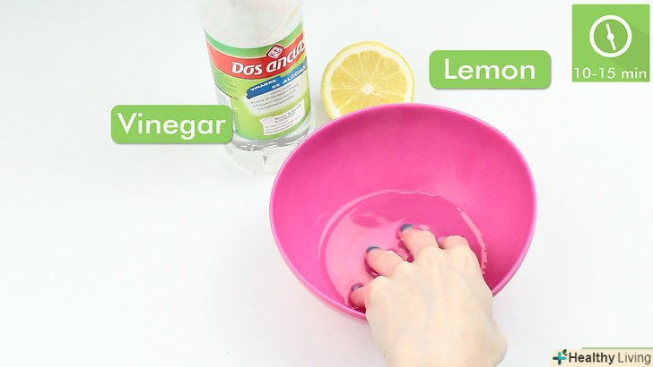 Застосуйте для зняття лаку білий винний оцет або розчин оцту з лимонним соком. оцет-універсальний кислотний засіб, який можна використовувати в якості натурального миючого засобу практично в будь-якому місці вашого будинку. Саме тому цілком розумно буде спробувати застосувати його і з метою зняття лаку з нігтів. Для посилення дії оцту в нього можна вичавити сік половинки лимона або додати трохи апельсинового соку, і тоді у вас вийде потужне засіб для чищення на цитрусовій основі.- Замочіть Пальці в оцті на 10-15 хвилин, перш ніж приступати до зняття лаку. Не намагайтеся стерти лак нігтями, інакше вони ослабнуть. [4]