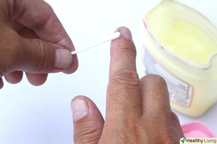 Пам'ятайте про запобіжні заходи. є кілька способів запобігти потраплянню лаку на шкіру пальців, коли ви фарбуєте нігті. Найчастіше з цією метою наносять навколо нігтів вазелін або клей ПВА. Це створює бар'єр між шкірою і лаком для нігтів, і в результаті зайвий лак набагато легше видалити. [7]- Нанесіть на шкіру навколо нігтів вазелін за допомогою ватної палички, перш ніж приступити до манікюру. Після того як ви пофарбуєте нігті, витріть вазелін інший ватною паличкою.