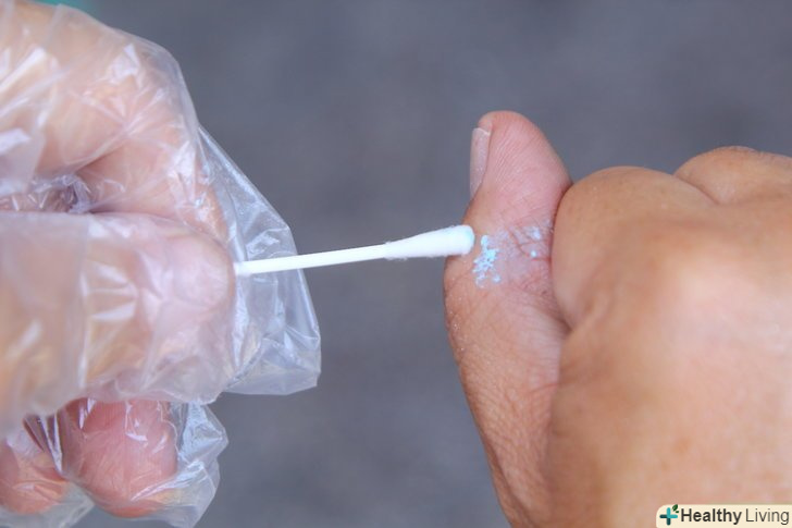 Виберіть, ніж нанести ацетон або рідина для зняття лаку. для невеликої ділянки прекрасно підійде ватний диск. Якщо ви забруднили велику площу, наприклад долоні, руки або ноги, краще використовувати рушник. Якщо вам потрібно просто підчистити нігті, подумайте про те, щоб використовувати ватяну паличку — можна взяти паличку за один кінець, а другим стерти лак.