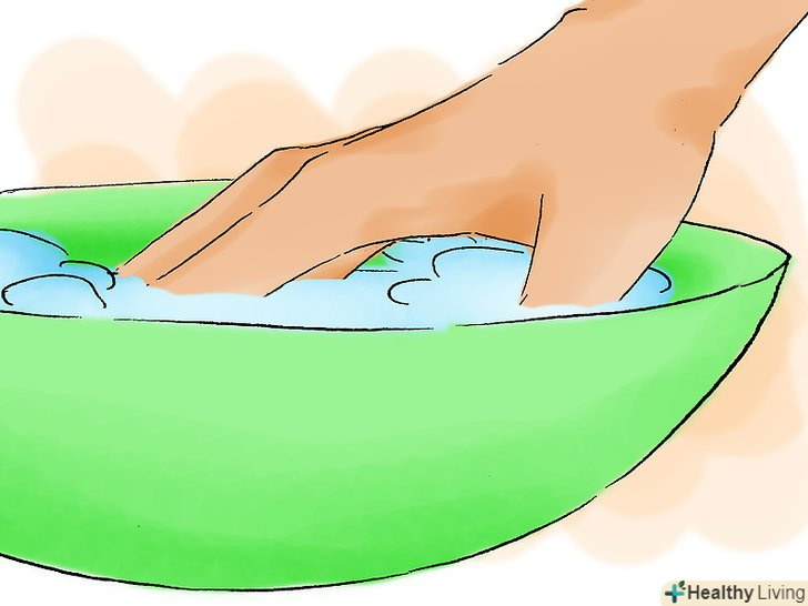 Наповніть ємність мильною рідиною. візьміть невеликий лоток і заповніть його теплою водою (переконайтеся, що вона не надто гаряча). Додайте ніжного мила, яке добре пахне і зволожує шкіру. Це допоможе впоратися з запахом ацетону і сірим ефектом, і послабить омертвілу шкіру на нігтях і кутикулу.- Якщо ви хочете і маєте в наявності, подумайте використовувати отшелушивающую щіточку з теплою водою і милом. Вона відлущує шкіру і залишає її яскравою і сяючою. [2]