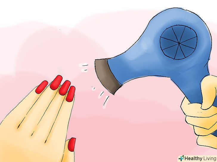В якості альтернативи, використовуйте вентилятор або фен. немає нічого гіршого, ніж пройти через всі неприємності, щоб зробити красиві нігті, а потім зіпсувати їх через хвилину. Так що, якщо ви можете, поставте вентилятор перед вашими нігтями і тримайте їх там протягом приблизно 20 хвилин.- З феном все відбувається трохи швидше, якщо у вас мало часу. Переключіть високу температуру повітря на середню і рухайте фен назад і вперед, переконавшись, що гарячі сплески повітря досягають кожного нігтя. Приблизно через п'ять хвилин, перевірте нігті, і продовжуйте, якщо це необхідно.