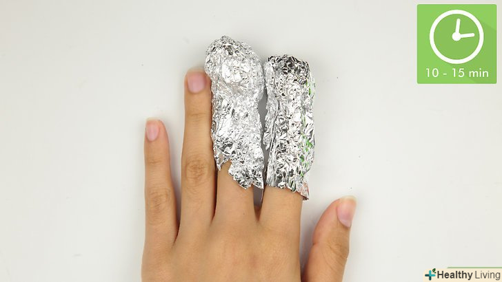 - Оберніть нігті у фольгу, щоб ватяні кульки залишилися на них. на кожен ніготь покладіть по одному просоченому ацетоном кульці. Потім оберніть їх невеликим шматочком алюмінієвої фольги, який повинен утримати ватяну кульку і повністю приховати кожен ніготь. [3]