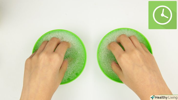Помістіть в гарячу воду 1-2 миски поменше. якщо ви хочете замочити обидві руки одночасно, знайдіть дві мисочки, які разом помістяться у великій мисці. Втім, набагато простіше використовувати одну маленьку мисочку і замочувати кожну руку окремо. [8]- При виборі миски переконайтеся, що вона досить велика, щоб вмістити всі 5 нігтів.