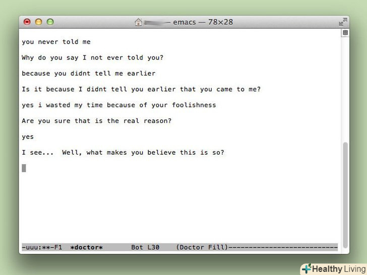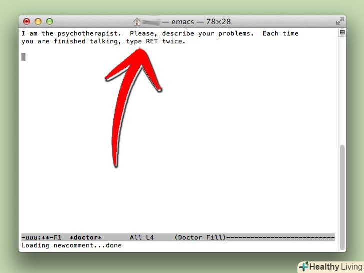 Введіть "Doctor".відобразиться текст " Я психотерапевт. Будь ласка, опишіть ваші проблеми. Кожного разу, коли ви закінчили говорити, натисніть RET двічі".