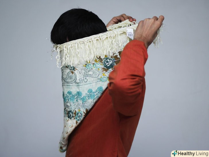 Візьміть правий кут правою рукою і лівий кут лівою рукою, трохи натягніть тканину, розводячи руки в сторони і піднесіть високо до голови.- Нахиліть трохи голову вниз і зігніть плечі, висуваючи вперед.