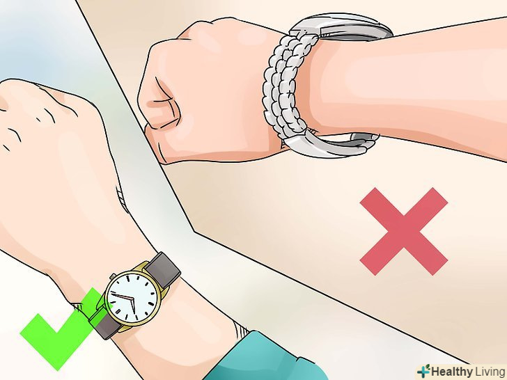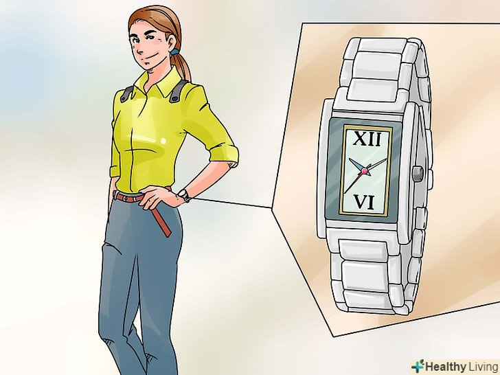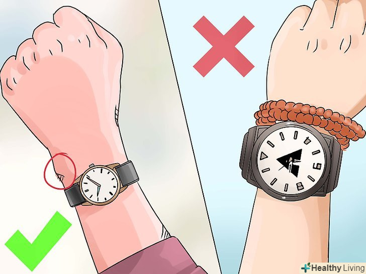 Носіть годинник на зап'ясті, поруч з кісточкою. переконайтеся, що циферблат знаходиться прямо поруч з кісткою на зовнішній стороні зап'ястя (ліктьова кістка). Коли ви стоїте, годинник не повинен виглядати з-під манжети вашої сорочки. При носінні сорочки годинник повинні бути видні тільки в разі згинання руки в лікті. Ніколи не носіть годинник поверх манжети. [2]