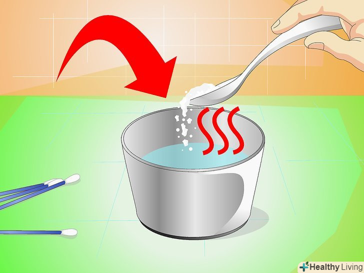 Розчиніть в теплій воді трохи морської солі. додайте в чашку 5 столових ложок гарячої води, потім приблизно 2,5 чайних ложки морської солі. Гарненько все перемішайте, щоб сіль як слід розчинилася. Тепер залиште розчин на деякий час, щоб він охолов. Як тільки розчин стане кімнатної температури, можна почати чистку. [3]- Мокніть в розчин ватний тампон або шматочок ватки, заодно перевірте температуру розчину.