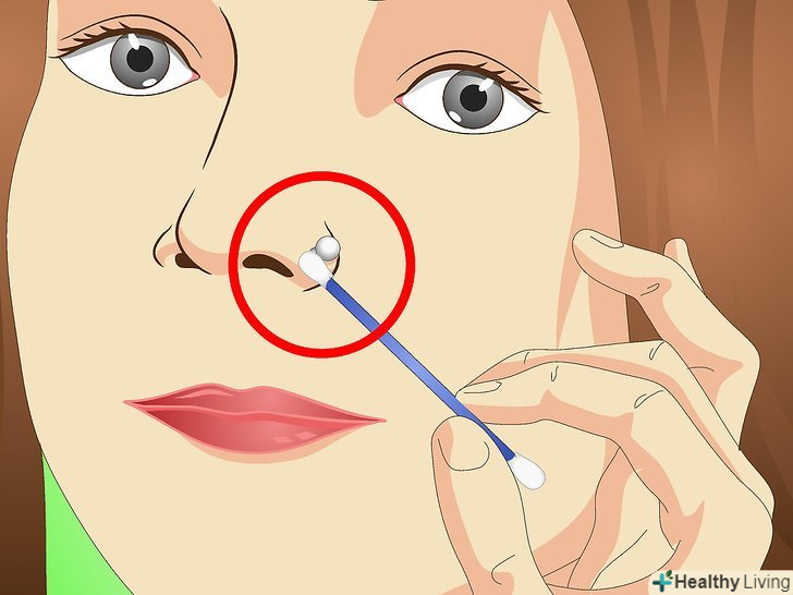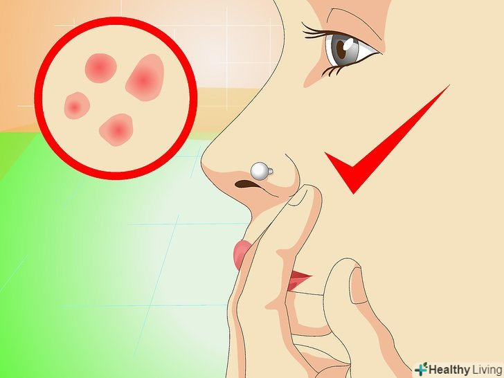 Не пропустіть ознаки інфекції. якщо навколо пірсингу почався запальний процес, шкіра навколо нього буде червоною і злегка припухлої, а їх ранки може постійно підтікати рідина. Якщо симптоми запалення не проходять, зніміть пірсинг і гарненько обробіть почервоніле місце. Коли симптоми почнуть проходити, простерилизуйте сережку або замініть її новою. Якщо необхідно, зробіть пірсинг носа заново. [4]- Якщо на пірсингу були мікроорганізми, які викликали інфекцію, обов'язково почистіть його. Крім звичайних засобів для чищення сережки використовуйте стерильний сольовий розчин.